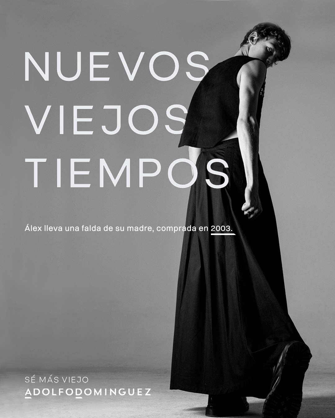 EN Ante el fast fashion y la fugacidad de las modas, Adolfo Domínguez reivindica la calidad y durabilidad de las prendas. Para evolucionar su posicionamiento: “Sé más viejo”, lanzamos “Nuevos Viejos Tiempos”. Una campaña que, lejos de ser antigua, visibiliza nuevos códigos y roles de género.